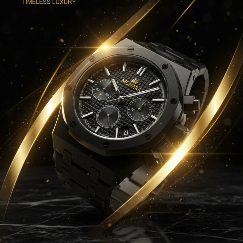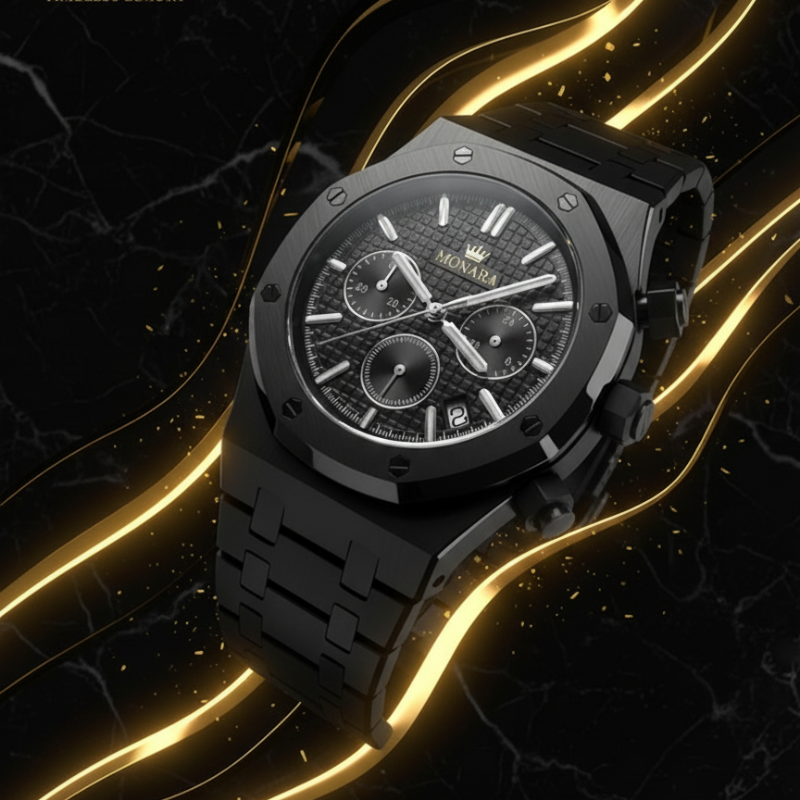 Der MONARA Black Chronograph besticht durch seine markante, komplett schwarze Optik mit einem dynamischen, strukturierten Zifferblatt, das Selbstbewusstsein ausstrahlt. Das präzise Chronographenwerk sorgt für höchste Genauigkeit und Zuverlässigkeit und macht ihn zu einem unverzichtbaren Accessoire für jeden Anlass. Mit seiner robusten Konstruktion und den sorgfältigen Details, einschließlich des legendären MONARA-Kronenlogos, ist diese Uhr ein echter Hingucker und bietet ein makelloses Erlebnis.